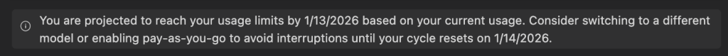 shiyang 2025年12月22日 关于Cursor,最开始开通的是 Pro,$20,后来开通了 Cursor Pro+,$60 一个月,用着用着给我弹出了这么个消息,这还不够我用?我没想到我对他的依赖程度已经这么大了。